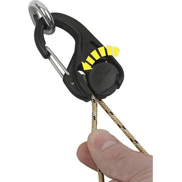 It offers a knot-free way to tighten, tension, and secure light loads when paired with narrow cord. The carabiner feature allows you to clip it to fixed anchor points, while the cam mechanism will lock cord in place with the desired amount of tension.