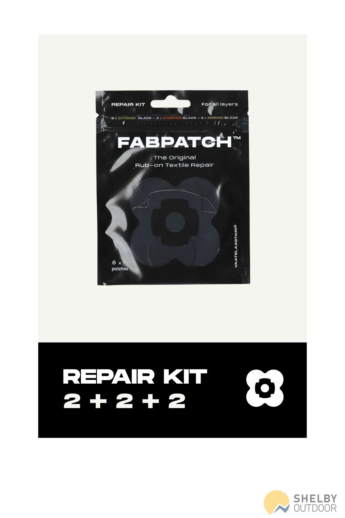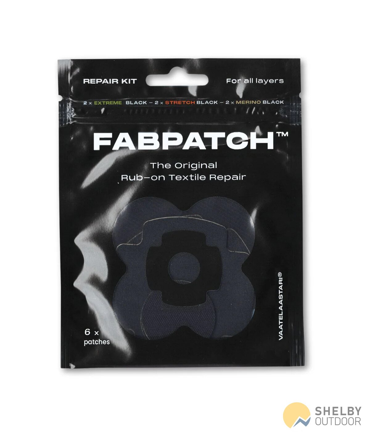 The Textile repair kit includes a collection of black FabPatch™ patches in various materials.